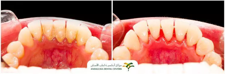 - تنظيف الأسنان العميق: يشمل إزالة طبقات البلاك والجير والبكتيريا من خط اللثة وتحتها، وتُعرف هذه العملية بالتقليح وكشط الجذور ويسمح بشفاء الأنسجة ويمكن إجراء العملية باستخدام أدوات، أو ليزر، أو جهاز موجات فوق صوتية.