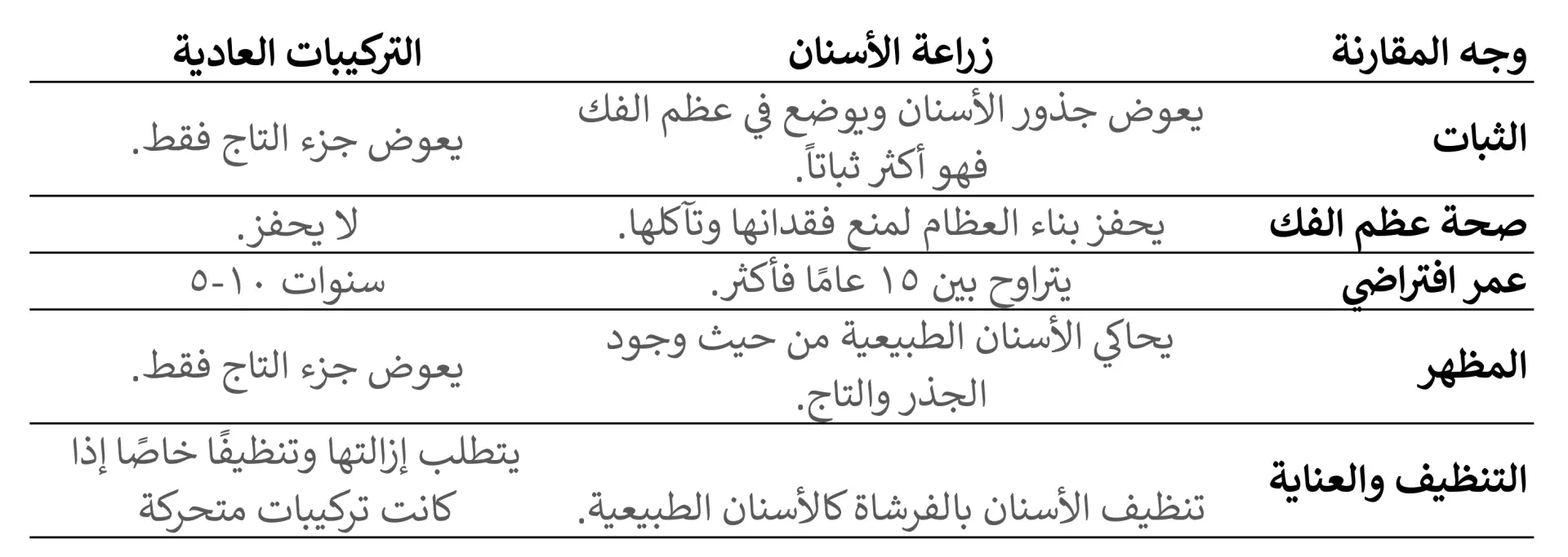 يشمل الفرق بين زراعة الأسنان والتركيبات العادية ما يلي: